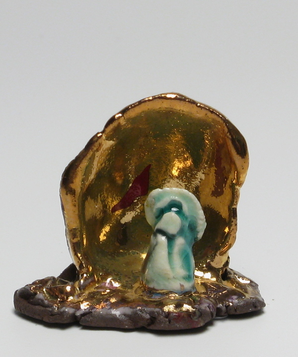 Materials: (Red clay, ball clay, Talc, Soft Grog, nickel chrome coil, transparent frite glaze, assiette a dorer rouge, Silver nitrate, Copper sulphate, ceramic raku firings to 1100oc).