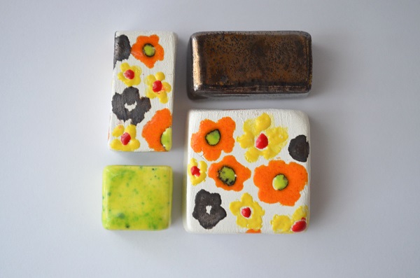 Materials: Buff clay, powdered glazes and transparent frite glaze. Temperature of firing: 1200°C