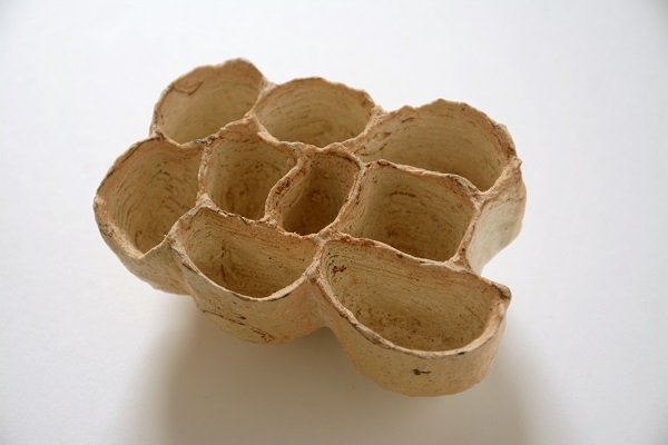 Material: paperclay, used pottery light-colour LA clay, and paper pulp. Type of firing: firing in a kiln for wood with ash deposit, slightly reduced firing. Temperature of firing: 1200°C